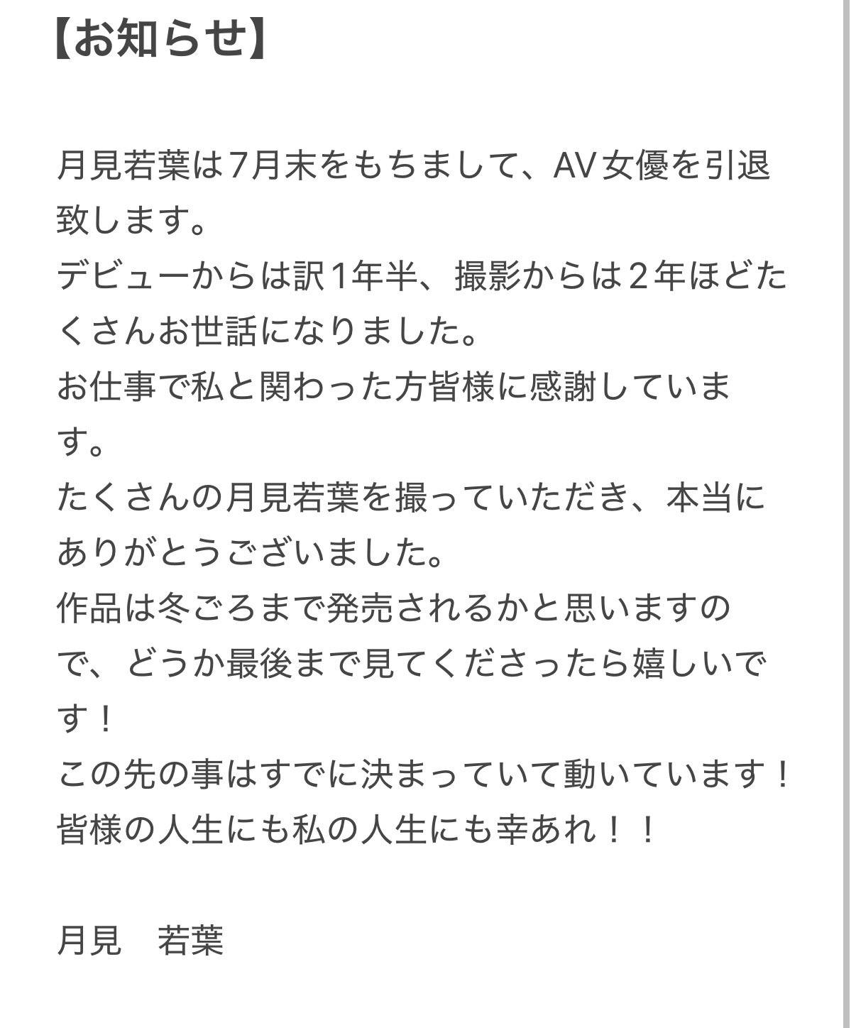 月見若葉さん、2025年7月末での引退を発表